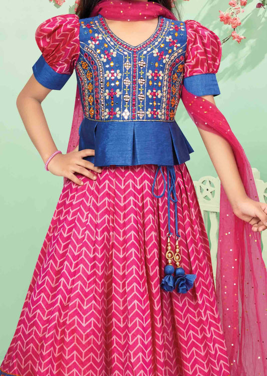 Blue / Rani Pink Silk Printed Kids lehenga