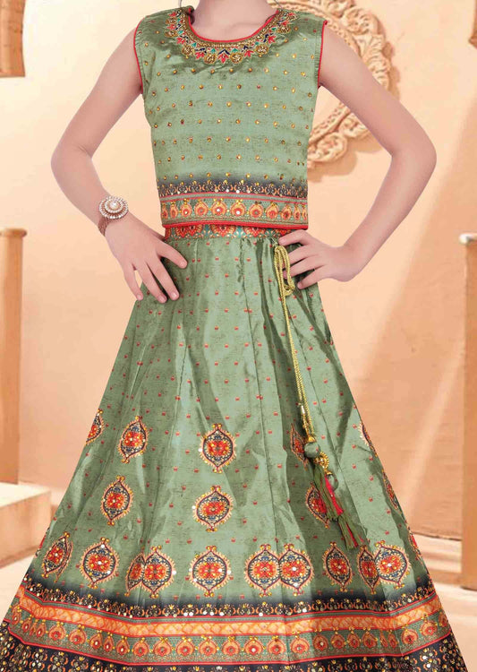Dusty Green Silk Printed Kids Lehenga