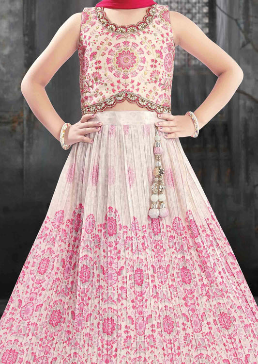 Cream/Pink Silk/Muslin Zardosi & Embroidered Kids Lehenga