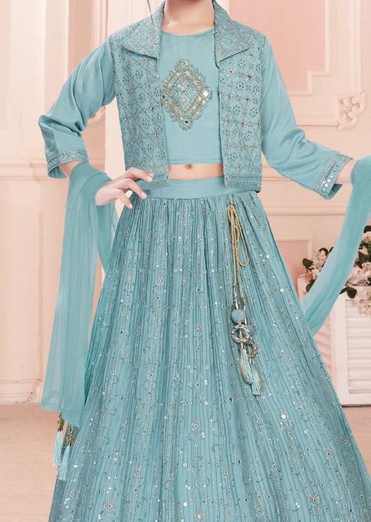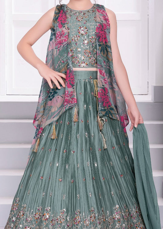 Dusty Green Chinnon Lehenga with Jacket for Kids