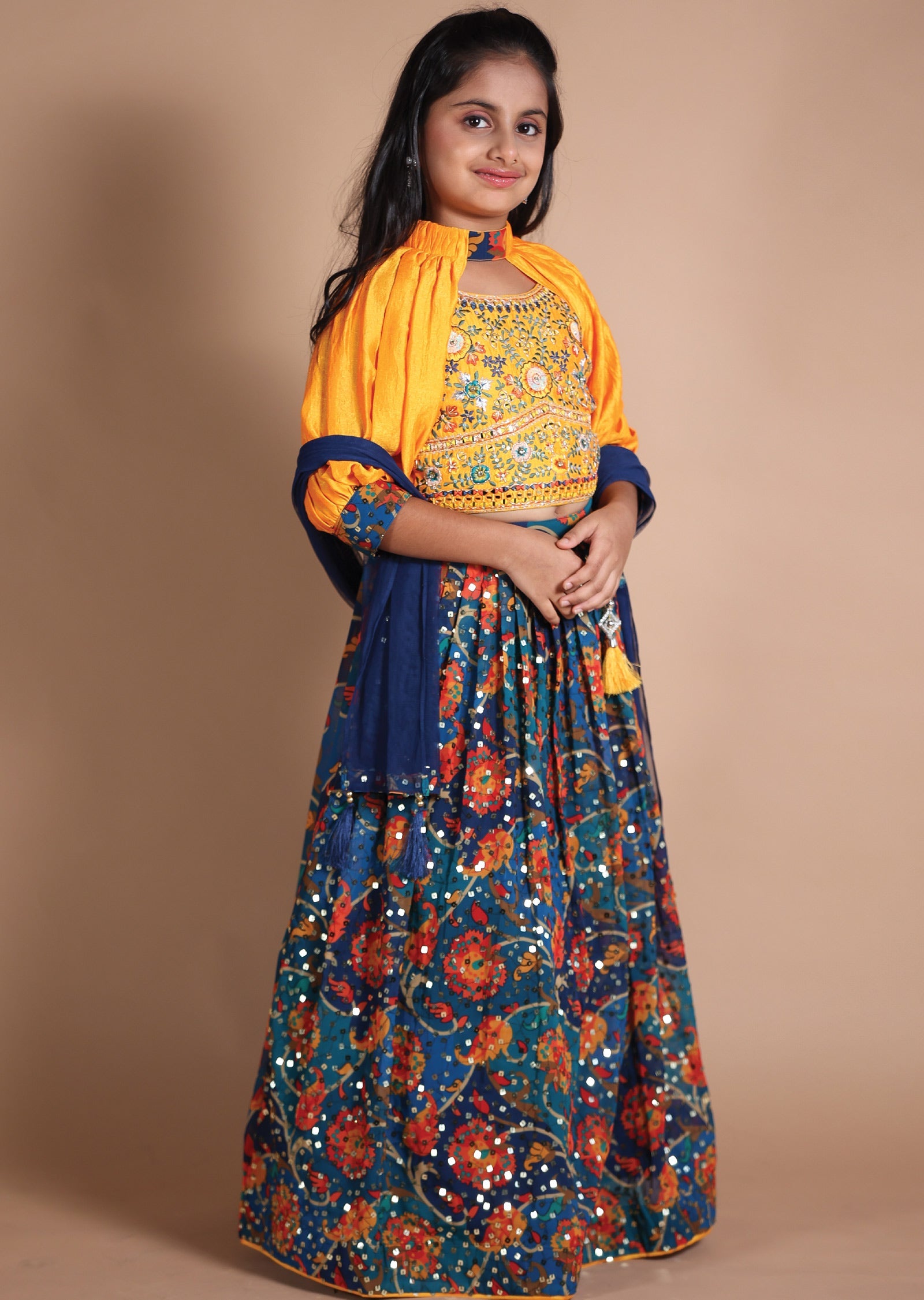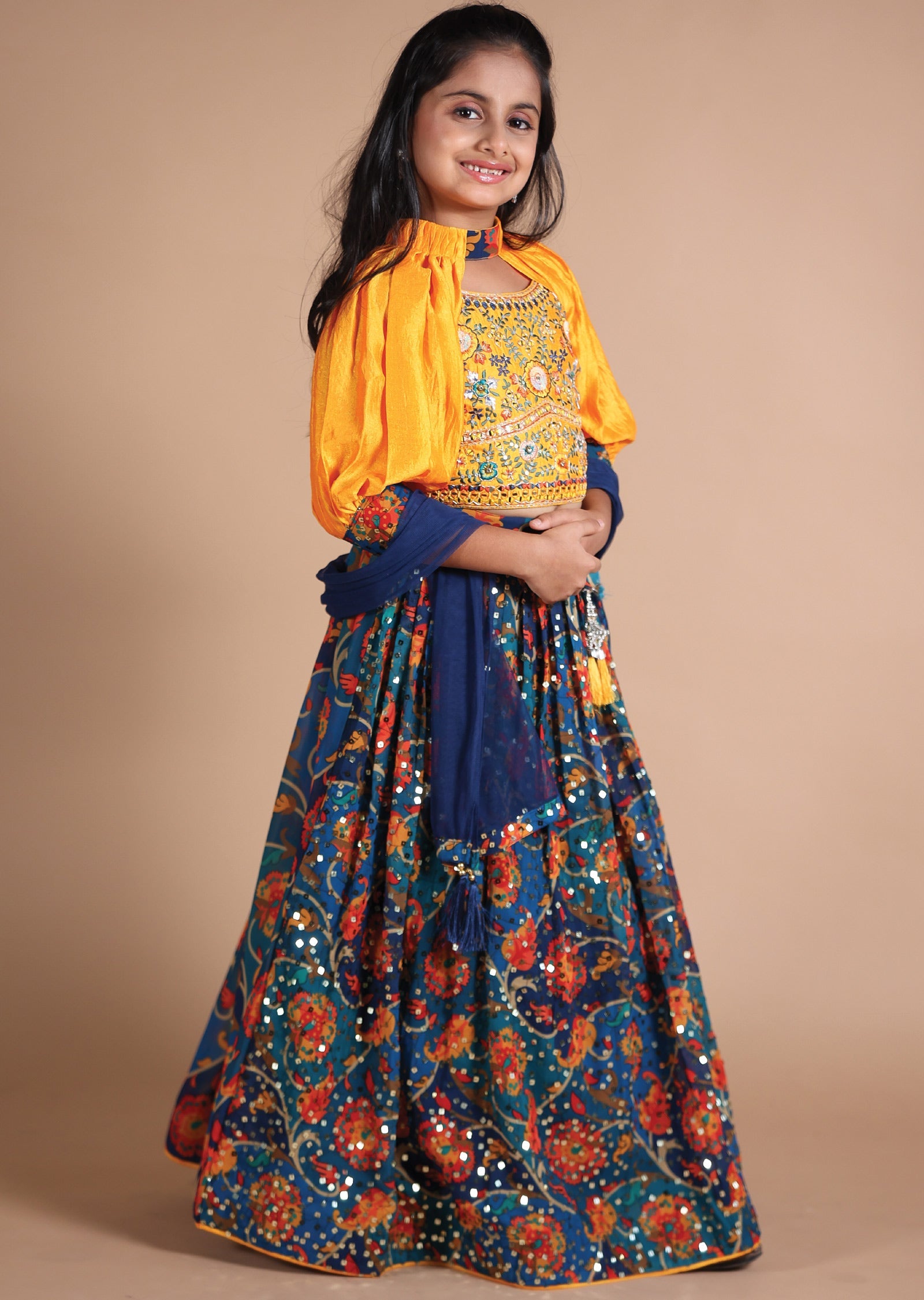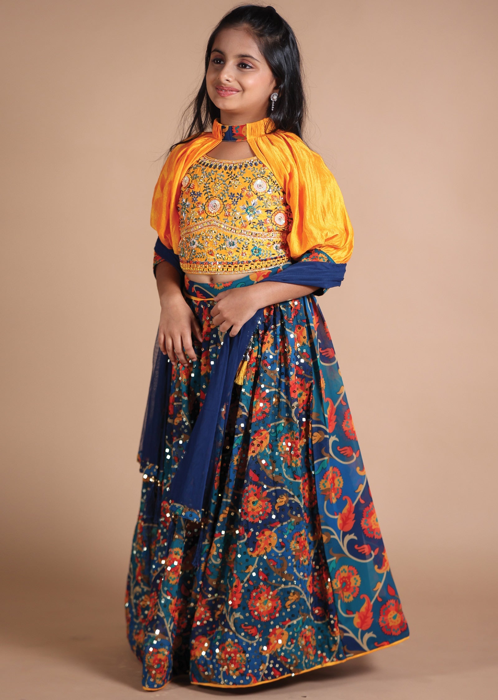 Mustard silk blouse with zari, resham, zardosi, sequence & mirror work, contrast peinted georgette lehenga with sequence work