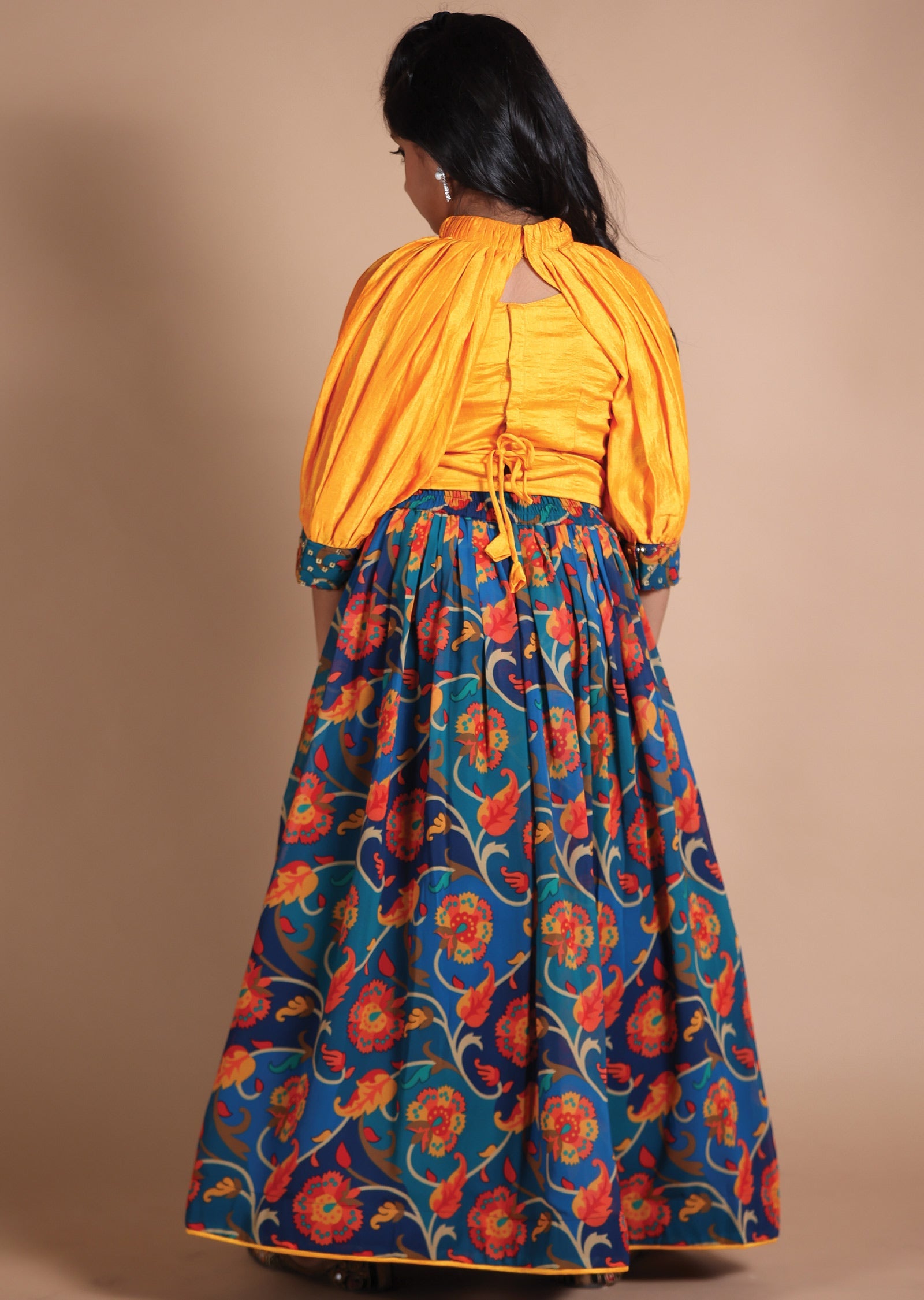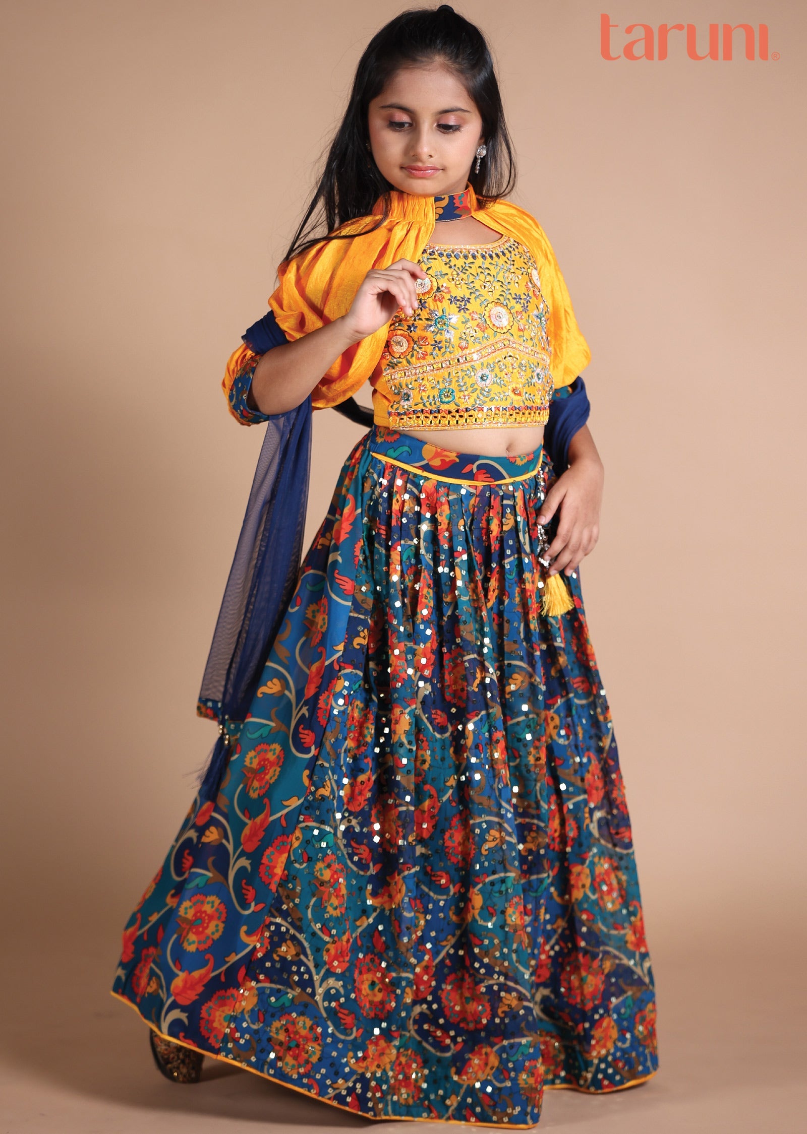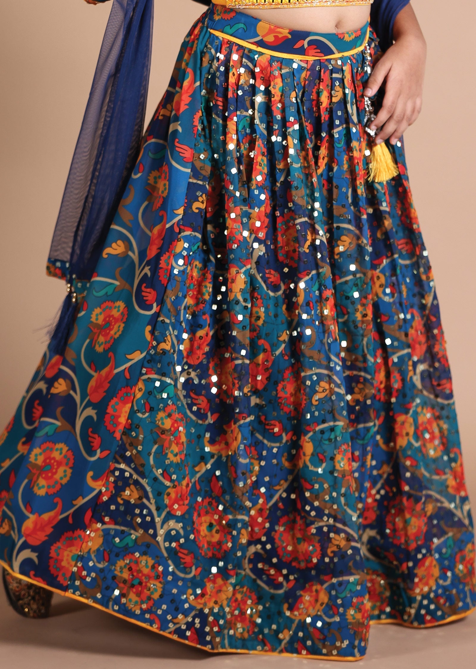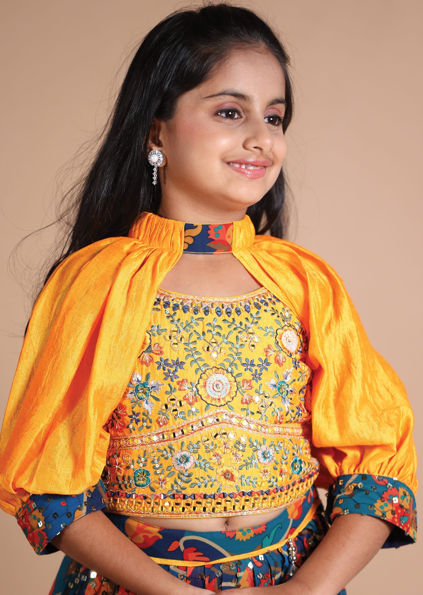 Mustard silk blouse with zari, resham, zardosi, sequence & mirror work, contrast peinted georgette lehenga with sequence work