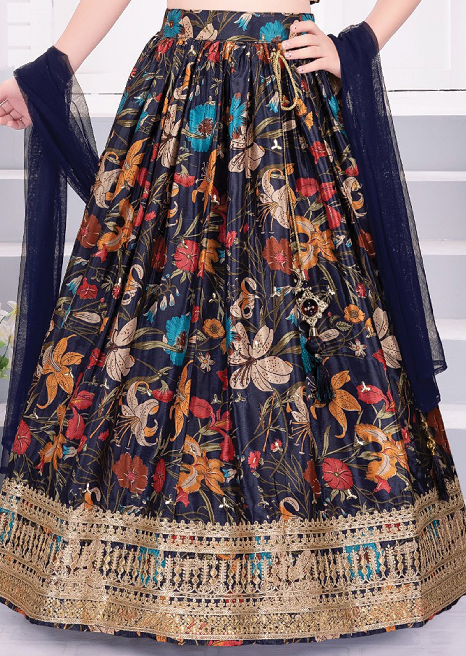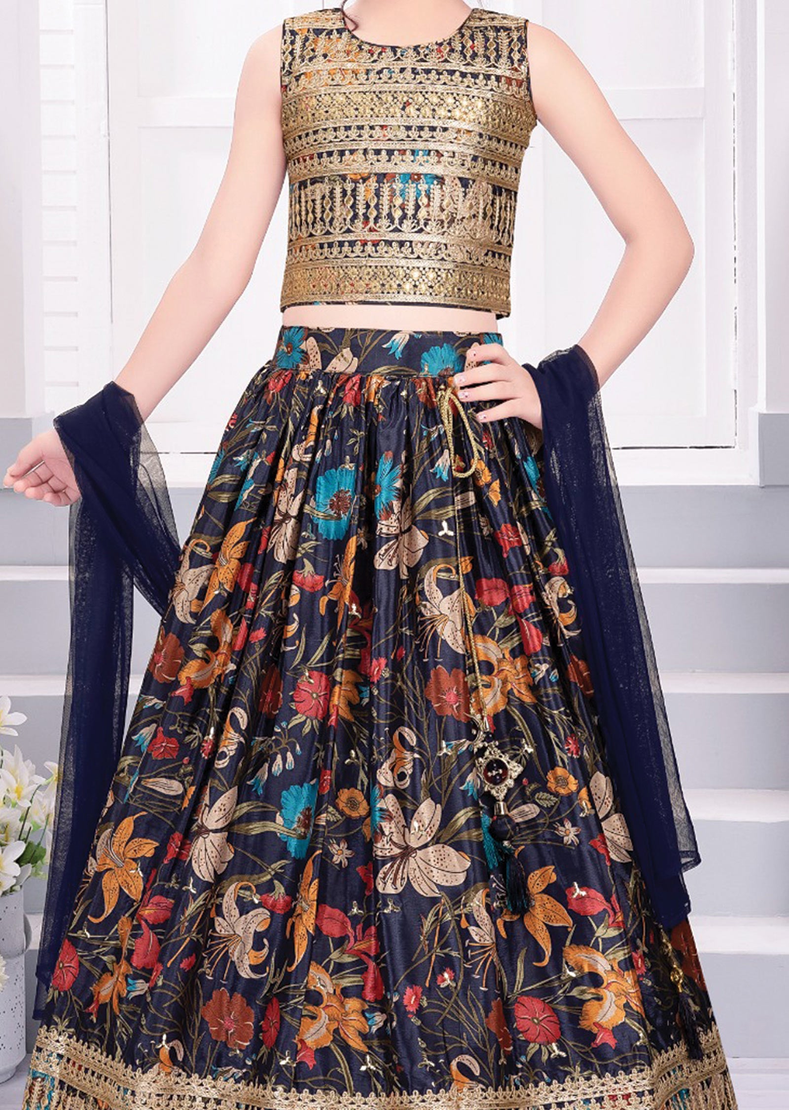 Navy Blue Chinnon Kids Lehengas